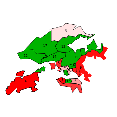 This Demonstration shows the dynamics of the spread of the SARS virus in Hong Kong's 18 districts when the optimal resources allocation is used. In the simulation, the color green represents an infection-free district, that is, one in which the number of infected people is smaller than one. For infected districts, shades of red are used to indicate the level of infection. Darker red means that there are more infected people in the region and lighter red means that fewer people are infected. The viewer can see that the virus is stopped very quickly using the optimal design: the regions quickly turn green regardless of the initial conditions.