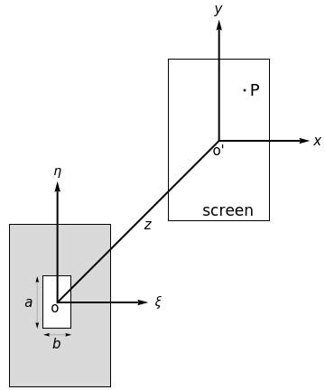 Consider a screen in the - plane. The rectangular aperture is in a plane parallel to it (the - plane). The perpendicular distance between the screen and aperture is given by . The dimensions of the aperture are .