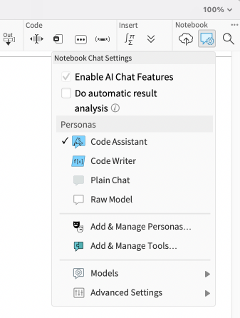 For older versions, to get started with the chat-enabled functions, you can create a new “Chat-Enabled Notebook” (" + n" or " + + n" on Mac) in Mathematica, or you can enable AI chat features in your standard notebook by clicking the “Chat notebook settings” button on the top-right of the toolbar and choosing “Enable AI Chat Features.”