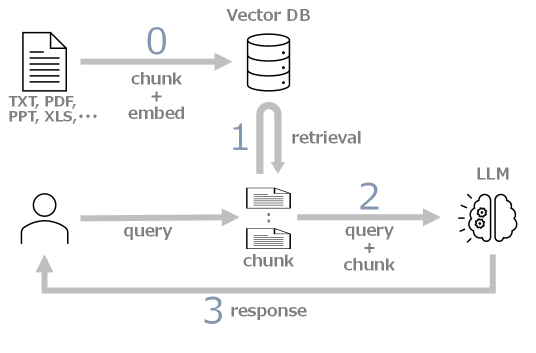 RAGの仕組みは以下となります。0. 事前準備 : ドキュメントを分割し、それをembeddingしたものとペアでデータベースの登録1. Retrieval : 質問に関連する情報をデータベースから検索2. Augmented : 質問に検索した情報を付け加え拡張してLLMに問い合わせ3. Generation : 問い合わせに対する回答を生成