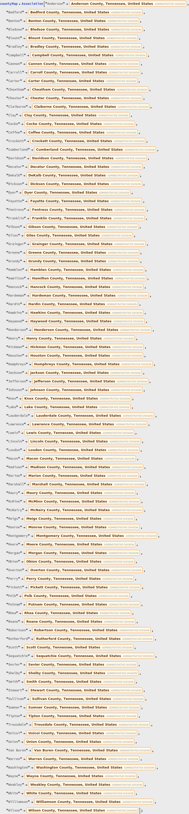 Set up the mapping between the counties that are on the TN Department of Health to the entities that are used to the entities that Wolfram understands. This is because the TN dataset has “Dekalb” while Wolfram has the correct “DeKalb”.