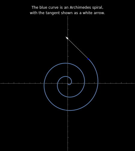 This Demonstration uses parametric equations and radius vectors to plot Archimedes's spiral (blue) and the curve of its tangents (orange), which represent the derivative. The function is in polar coordinates or in this implementation, in rectangular coordinates.