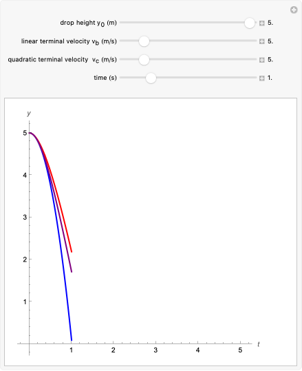This Demonstration shows plots of the one-dimensional downward trajectory of a falling body as a function of time. The cases considered are: no air resistance (blue), linear resistance (red), and quadratic resistance (purple). The drop height (vertical axis) is in meters and the horizontal axis is time in seconds. The acceleration due to gravity is set to . You can vary the drop height , the terminal velocity for linear air resistance , the terminal velocity for quadratic air resistance , and the time , in order to see where the object is at a certain time.