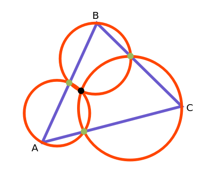 Let A', B', and C' be points (green, not labeled in the figure) on the sides BC, CA, and AB of the triangle ABC. Then the circumcircles through the triangles AB'C', A'BC', and A'B'C intersect in a common point.