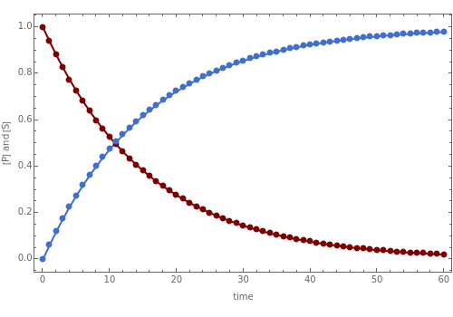 This Demonstration shows the substrate concentration,[S], (red curve) and the product concentration,[P], (blue curve) versus time obtained using the exact approach. The bold dots correspond to the quasi-steady-state approach. Agreement between both methods is obtained and justifies the utilization of the pseudo-steady-state hypothesis, which is also called the quasi-steady-state approach.