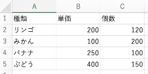種類,単価,個数,リンゴ,200.,120.,みかん,100.,200.,バナナ,250.,100.,ぶどう,400.,150.