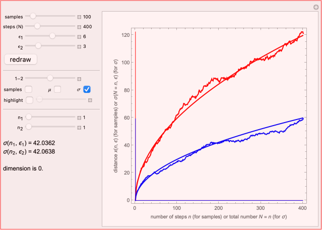 When adjusting the sliders and so that , you can check that the computed dimension = is around 2, with an error depending on how far the experimental 's are from their theoretical values (the more samples, the smaller the error).