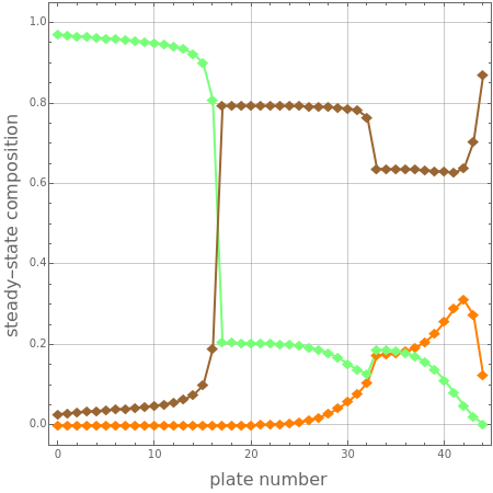 The Demonstration solves the MESH equations (mass,equilibrium, summation, and heat) and displays the composition and temperature profiles for user-set values of the reflux ratio, . The second degree of freedom is set by taking a distillate flow rate equal to .