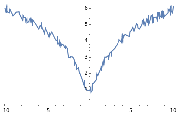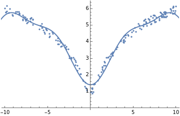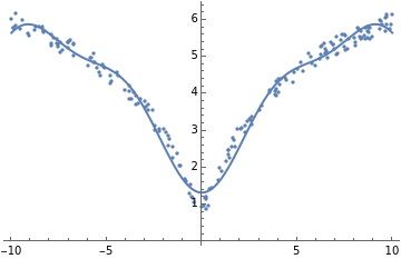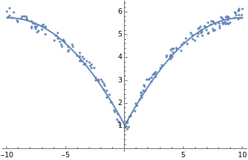 次は、x=-10から10までの範囲に対し Log[2 + 3x^2] をy値とし、さらにノイズ(0から0.5までの一様乱数)を加えた複雑なデータを用意します(SeedRandom[1234]は生成される乱数列を固定するため)。