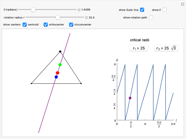 Let be a triangle in the plane. This Demonstration shows how the angle of the Euler line of changes as the vertex rotates about the midpoint of on a circle of variable radius . An accompanying graph plots versus the rotation of along its path (measured in radians). The relationship between the two angles changes with .