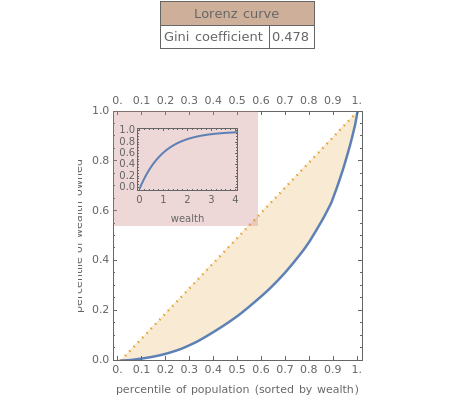 The Lorenz curve is a measure of the distribution of wealth (or income or other factors) in a society. The value of the curve corresponds to a percentile of the population ordered according to the characteristic in question. The value of the curve represents that portion of the total value of the characteristic in question held by people no wealthier than the -valued percentile of the population. Thus, the value (0.7, 0.3) means that the bottom 70% of the population owns 30% of the total wealth in society. The Gini coefficient is the (shaded) area between the Lorenz curve that would exist in a perfectly egalitarian society (the dashed line) and the Lorenz curve that does exist, divided by the area under the Lorenz curve that would exist in a perfectly egalitarian society. The coefficients are thus normalized to run from zero in a perfectly egalitarian society, to one in a society in which the wealthiest person held all the wealth. By way of reference, the United States has a Gini coefficient of 0.4; Sweden has a Gini coefficient of 0.25; Bolivia has a Gini coefficient of 0.61. This Demonstration allows you to select a random distribution from which to draw the wealths of the members of a size-selectable population. It computes the corresponding Lorenz curve and Gini coefficient and insets the corresponding cumulative distribution of wealth.