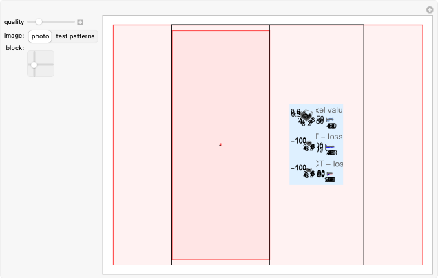 This Demonstration shows how a two-dimensional discrete cosine transform works on the image blocks during JPEG compression and how the data is degraded by the quantization matrix. Red points in the graphs on the right side display zeros, which are important for the file size reduction. More zeros give more size reduction but worse image quality. You can choose photos and images with patterns; most of them are difficult to compress by the JPEG algorithm.