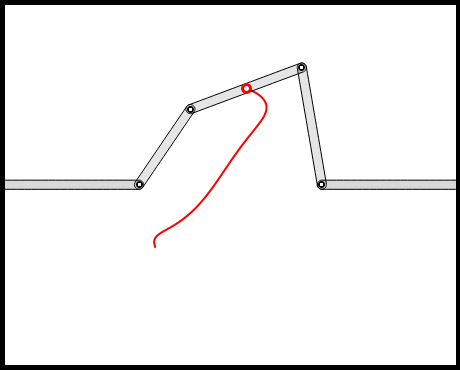 Snapshot 1: if the three bars have similar lengths, the center of the coupler bar draws a lemniscate with two substantial, almost rectilinear parts