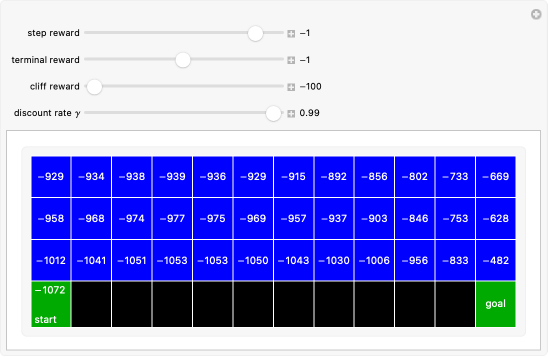 This Demonstration simulates the state values in the cliff walking problem of reinforcement learning. In this scenario, a grid is shown with the start and goal states located at the bottom-left and bottom-right corners, respectively. The black grid squares at the bottom are called "the cliff" and should be avoided. The agent's task is to get from the initial state to the terminal state using the possible actions up, down, right and left with the same probability. If the agent falls down a cliff (enters the black grid), it gets a negative cliff reward as a penalty and is sent back to the start. The colors in the grid correspond to the actual state values. The lighter blue colors are preferred, with the agent trying to avoid the darker blues. The goal is to achieve the desired rewards with a given discount rate.