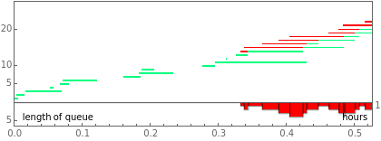 In the Demonstration graphic, the number of people in the queue is indicated by the height of the red bars at the bottom; the horizontal green lines indicate customers being served; red lines indicate customers waiting. The table below the graphic shows the expected and observed values of several values associated with such a process. Note that the basic units are hours, but some of the parameters are given in minutes.