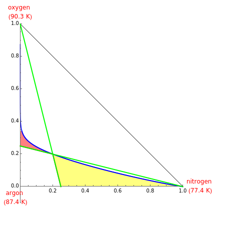 This Demonstration plots the residue curve (RC) for a ternary mixture composed of oxygen, nitrogen, and argon. The yellow and the pink areas are the regions where distillate and bottom compositions, respectively, are feasible for a packed column. This is a cryogenic process, with the temperatures in the diagram varying between 77.4 K and 90.3 K, the boiling temperatures of nitrogen and oxygen, respectively.
