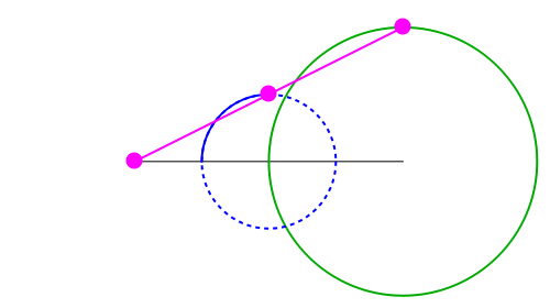 The locus of midpoints of the line from some point to the points of a circle of radius is a circle of radius . You can drag the point on the large circle or the point at the other end of the line.