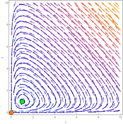 This Demonstration shows a phase portrait of the Lotka–Volterra equations, including the critical points. The eigenvalues at the critical points are also calculated, and the stability of the system with respect to the varying parameters is characterized.