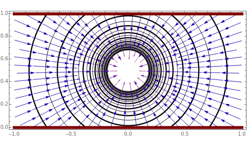 The electrostatic problem of a point charge inside a capacitor made of two parallel grounded electrodes is illustrated in this Demonstration. The electric potential and field can be calculated as an infinite sum of image charges. On the left you see the space between the two parallel plates represented by horizontal red lines. Move the point charge and view the resulting electric field (blue stream-lines) and equipotential lines (black). On the right, you can see the set of real and image charges (red for positive, blue for negative) as well as the location of the two real plates (solid red lines) and several of their images (dashed gray lines).