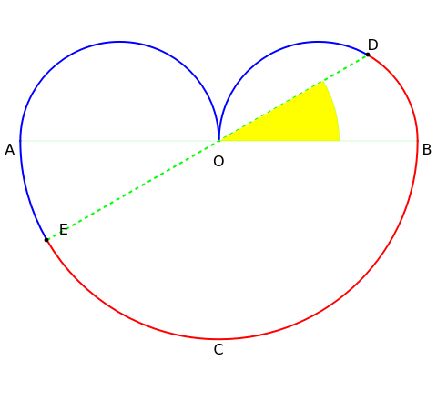 A curve consists of two semicircles of radius 1 and one semicircle of radius 2. A chord through the origin and inclination divides the curve into two parts, red and blue. Which curve is longer?