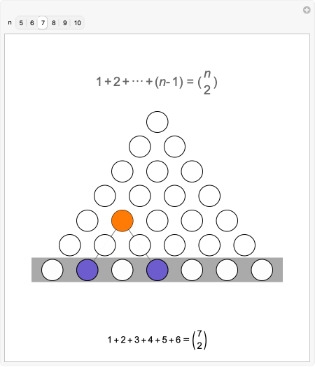 Ok, just in case, here are some words: The number of subsets of size two taken from a set of size is denoted by , read as choose 2. This Demonstration shows that for each such subset (shown as two blue disks in the bottom row) there is a unique orange disk in the triangle above. Since there are disks in this triangle (one summand for each row), this sum must be equal to . Click any disk above the bottom row to explore this association.