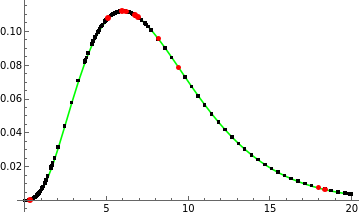 func@x_=PDF[GammaDistribution[4,2],x]gr1=Plot[func@x,{x,0,20},PlotStyleGreen];pts=First@Cases[gr1,Line@pts_pts,Infinity];gr2=ListPlot[pts,PlotStyleRed];exactSample={#,func@#}&/@(Rationalize[#,10^-24]&@@@Sort@RandomSample[pts,10]);Show[gr1,ListPlot[pts,PlotStyleBlack],ListPlot[exactSample,PlotStyleRed]]