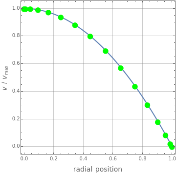 The velocity profile versus radial position is obtained for the steady-state laminar flow of power-law and Carreau fluids in a pipe. The pipe radius is and the applied pressure gradient is =1. For both the power-law and Carreau fluids, the green dots represent the solutions obtained using the Chebyshev collocation technique. The velocity profile for a power-law fluid (the blue curve) is obtained from the analytical solution given by [1, 2]. The velocity profile for a Carreau fluid (the red curve) is obtained using the shooting technique and the built-in Mathematica function NDSolve. For both fluids, you can vary the exponent (see Details section).