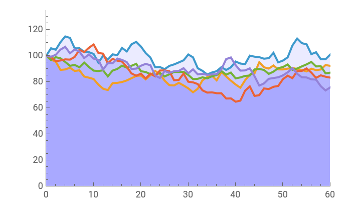 A sample of 100 runs is generated and ranked by ending value. The series actually displayed are those at the , , , , and percentiles in this sample.