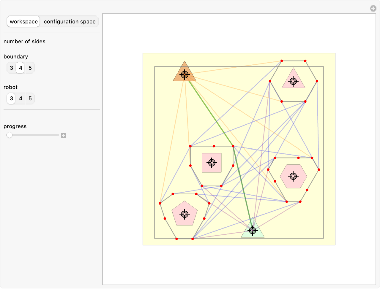 Motion planning seeks a continuous sequence of valid configurations for a robot to move from the initial position to the destination position. Valid configurations do not enter or collide with any obstacle. In this Demonstration, you can drag locators to change the initial and destination positions of the robot and obstacles. Move the "progress" slider to follow the robot's path. You can change the number of sides for the robot or the boundary. Switch between the workspace and configuration space to see the obstacles and path in each space.