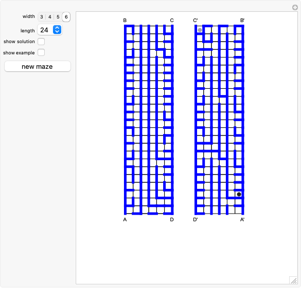 This Demonstration shows how to make a paper model of a maze on a Möbius strip. Print the graphic and glue the two rectangles together so that they are the front and the back side of one rectangle, matching the letters on each side. Make a Möbius strip by twisting the strip and attaching to . If you are looking at the maze on the screen, as you go through the top of one rectangle you would move to the bottom of the other rectangle.