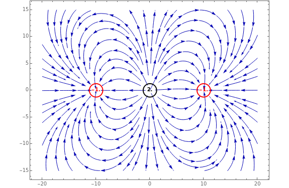 The electric field of a point charge at is given (in Gaussian units) by . The lines of force representing this field radiate outward from a positive charge and converge inward toward a negative charge. The composite field of several charges is the vector sum of the individual fields. In this Demonstration, you can move the three charges, shown as small circles, and vary their electric charges to generate a stream plot of the electric field.