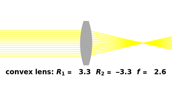 The lens index of refraction is given by . Optical-quality glass has in the vicinity of 2.65. The top slider enables you to vary between 1.0008, its value for air, and 3.42, the refractive index of diamond.