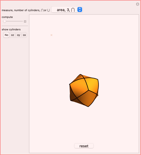 This Demonstration shows the intersection and union of two or three cylinders and calculates their areas and volumes.