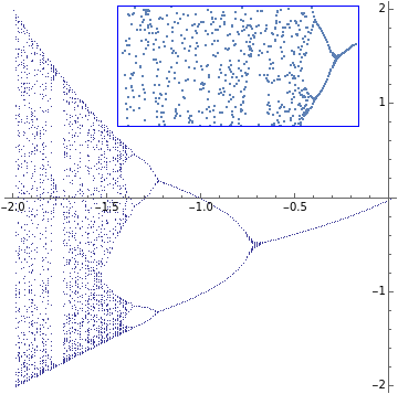 Plot the points , where =0 and the are the iterates of the quadratic map . Each leads to a distinct orbit; for example, for , the orbit is 0, -1.5, 0.75, -0.9375, …. For constant λ, the set of is infinite, but in this picture only a finite sample is shown. The whole plot is called the orbit diagram for the map. The set of points on the right that looks like a curve consists of stable points. In the middle the points orbit between two values. Both of these cases are examples of attractors.