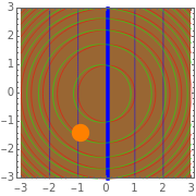 • bottom-left: same as upper-right, but with a contour representation, which shows more clearly the contour lines and the extremums of the three functions involved. The orange point is the one given by the 2D slider. When equilibrium is forced, it shows the solution of the problem (top of the green function ); otherwise it can be used to explore the slopes with the bottom-right panel.