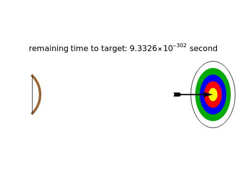 The distance traveled by the arrow toward the target can be represented by an infinite series ++++…=. It is now understood, of course, that an infinite series can converge to a finite limit. In the present case, =1. Let us assume that in real life, the arrow hits the target 1 second after release. The time remaining after steps, each halving the remaining distance, is then shown in the graphic.
