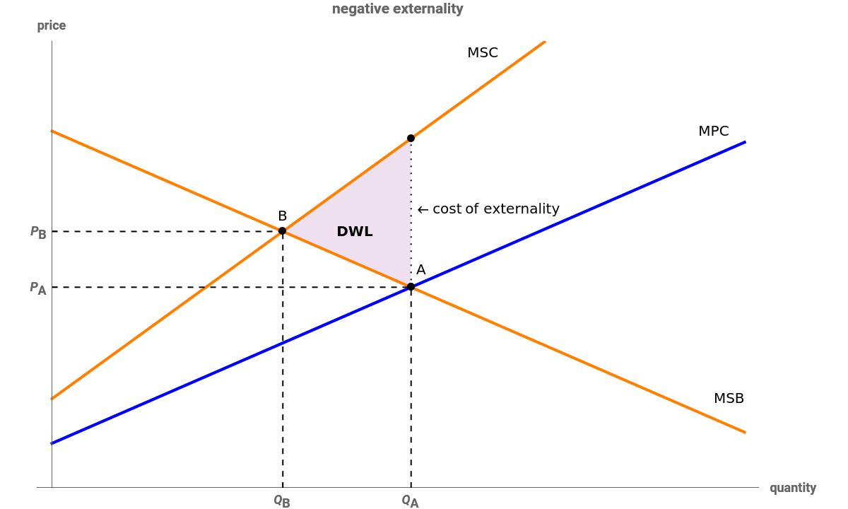 A negative externality is a type of market failure in which an individual does not bear the full cost of a good or service. A good with a negative externality imposes external costs on society beyond those paid for by the consumer. In this example, the socially optimal point is point , where marginal social cost MSC is equal to marginal social benefit MSB. At this level, units of the good are sold for a price . However, the market operates at point because individuals are concerned with their marginal private costs MPC rather than the social costs. We see that the cost per unit for the consumer is lower than the cost per unit to all of society, and the result is over-consumption of the good at level along with deadweight loss DWL, which is the loss to the economy due to transactions that do not occur because a market is not operating at its optimal point. By taxing the good, the government increases the marginal private cost to lower the level of consumption down to the socially optimal .