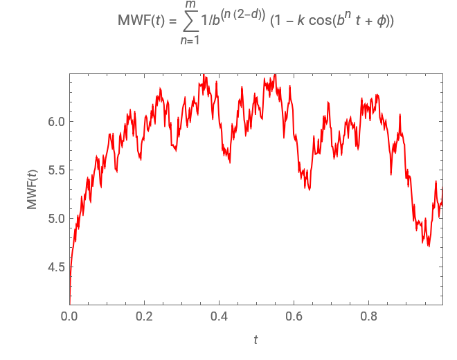 This Demonstration helps the user to visualize the jaggedness of an irregular line, time series, or signature by allowing its generation at different apparent fractal dimensions (in the range 1 to 2) using the Mandelbrot–Weierstrass function as the model. The function is displayed above the plot. The values of four of the function's five parameters , , , and are set using sliders while is fixed at 1; is the apparent fractal dimension, is the number of terms computed from the infinite series, is the phase, is the frequency multiplier, and is the scale factor. The number of generated points, which determines the resolution and the starting point in the plot, is also entered with sliders. You can create plots of controlled jaggedness and resolution whose morphology is different in detail. This highlights the roles of the mathematical jaggedness as represented by the fractal dimension and the resolution that in real plots is determined by practical considerations.