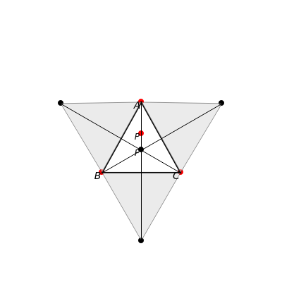 The Fermat point minimizes the sum of the distances from to the vertices of an acute triangle. In an acute triangle, the angle formed by the segments connecting any two vertices with is 120 degrees. Also, if one forms an equilateral triangle using two of the vertices of the original triangle, the third vertex of the equilateral triangle lies on a line through and the third vertex of the original triangle. These equilateral triangles are shown in gray.