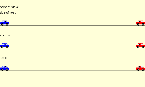 Two cars move toward each other at different speeds. Both drivers see that the other car moves with a speed equivalent to the sum of the individual speeds. The three points of view are from the side of the road, from the blue car as if it were at rest, and from the red car as if it were at rest. This is an example of relative motion.