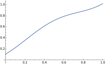 Plot[Sum[Sum[((-1)^kLegendreP[n,k,2,-3/5])/((1-(-3/5)^2)^(k/2)k!)(n+1/2)LegendreP[n,x]NIntegrate[t(6/5(t+1)^(t+1)/(t+2))^kD[6/5(t+1)^(t+1)/(t+2)-3/5,t],{t,0,1}],{k,0,n}],{n,0,7}],{x,0,1}]