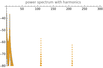 Plot[{20Log10[Abs[V[f]]],20Log10[Abs[X_d[f]]]},{f,0,3/gT_samp},PlotRange->{-80,-30},PlotStyle->{Normal,Dashed},PlotLegends->"Expressions",PlotLabel->"power spectrum with harmonics"]