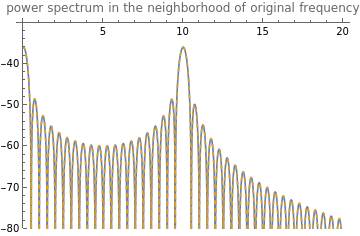 Plot[{20Log10[Abs[V[f]]],20Log10[Abs[X_d[f]]]},{f,0,2g_f0},PlotRange->{-80,-30},PlotStyle->{Normal,Dashed},PlotLegends->"Expressions",PlotLabel->"power spectrum in the neighborhood of original frequency"]
