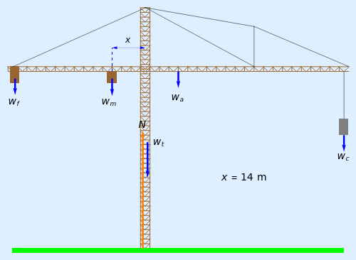 Suppose the arms have a mass of 100 tons , the lengths of the short and long arms are 56 m and 84 m, and that the center of mass is in the middle at 14 m to the right of the center of the tower. The fixed and mobile counterweights weigh 100 tons and 120 tons and ). The normal force and the weight of the tower do not generate any torque. Let be the weight of the load.