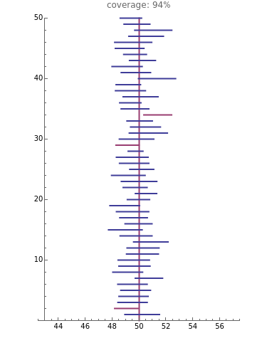A confidence interval is a way of estimating the mean of an unknown distribution from a set of data drawn from this distribution. If the unknown distribution is nearly normal or the sample size is sufficiently large, the interval ±is a confidence interval for the mean of the unknown distribution, where is the sample mean, is the quantile of the T-distribution with degrees of freedom, is the sample standard deviation, and is the sample size. If this interval were computed from repeated random samples from the unknown distribution, a fraction approaching of the time the mean of the distribution would fall in the interval. This Demonstration uses a normal distribution as the "unknown" or population distribution, whose mean and variance can be adjusted using the sliders. In the image, the vertical brown line shows the value of the mean of the "unknown" distribution, and the horizontal lines (blue if they include the true value and red if they do not) are each confidence intervals computed from different random samples from this distribution.