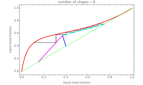 The horizontal and vertical axes are the liquid and vapor mole fractions. The red curve is the equilibrium curve. In fact, every liquid with mole fraction is in equilibrium with its vapor with mole fraction . The line segments allow a visualization of the steps, which are equilibrium stages.