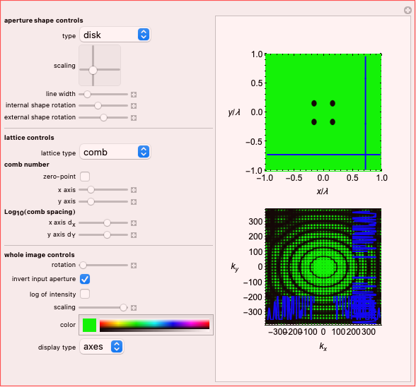 This Demonstration shows an aperture (top) and its 2D Fourier transform (bottom). These can be pictured as an aperture illuminated by plane waves and the diffraction pattern in an optical system with a small Fresnel number. Note how lines of symmetry are shared in the aperture and its Fourier transform and how these are preserved under rotations. Particularly important is the way that the Fourier transform scales with the aperture—if the aperture widens, then the Fourier transform narrows in the same direction, and vice versa. It is instructive to note how the same processes apply analogously when looking at lattices of apertures.