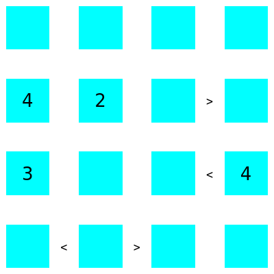 Futoshiki ("inequality" in Japanese) is a sudoku-like logic puzzle in an square where the digits 1 to each appear exactly once in each row and column. Some digits and mathematical relations are given as clues. Normally, just greater than (>) and less than (<) are used between squares, but this generator gives some additional options.