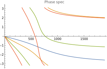 Plot[{Arg[H[2,I*ω]],Arg[H[3,I*ω]],Arg[H[5,I*ω]],Arg[H[7,I*ω]]},{ω,0,3*settings[["ωc"]]},PlotRangeFull,PlotLegends{"n=2","n=3","n=5","n=7"},PlotLabel"Phase spec"]