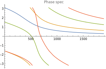 Plot[{Arg[H2[2,I*ω]],Arg[H2[3,I*ω]],Arg[H2[5,I*ω]],Arg[H2[7,I*ω]]},{ω,0,3*settings[["ωc"]]},PlotRangeFull,PlotLegends{"n=2","n=3","n=5","n=7"},PlotLabel"Phase spec"]